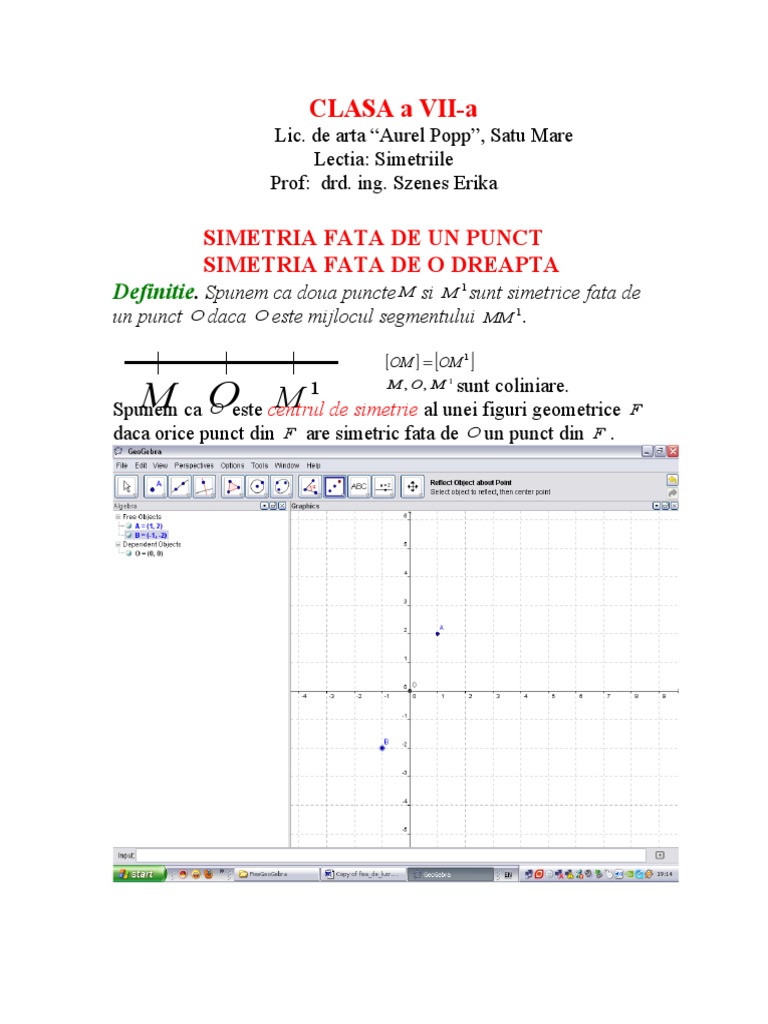 vizitati articolul complet aici : https://www.geogebra.org/m/XJh5sBEc Simetrica unei figuri geometrice f fata de o este o figura geometrica f ' astfel incat fiecare punct al lui f sa aiba un simetric fata 2). Acum am format un segment, segmentul ap. Astfel stim de la simetria unui punct fata de un punct ca: